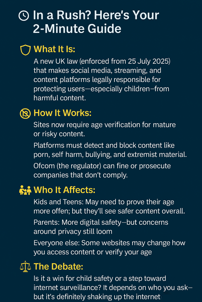 The Online Safety Act, now enforced by Ofcom, targets online platforms—think TikTok, YouTube, Instagram, streaming services—to protect kids and teens from harmful content. Here’s what’s changing: