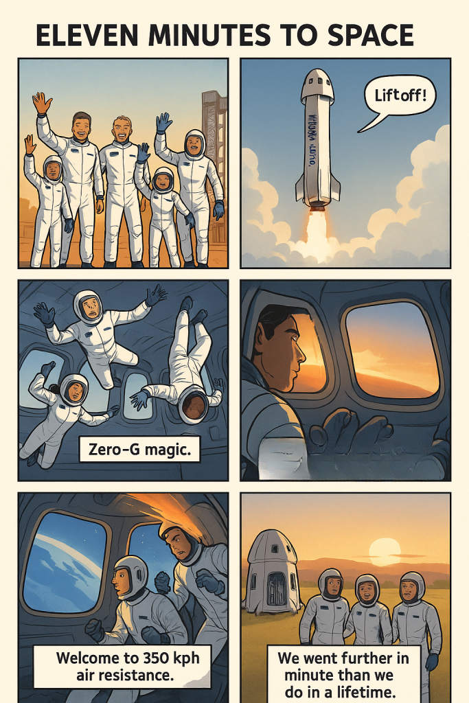 - 🚀 Liftoff: The capsule launched from West Texas, soaring beyond the Kármán line (~100 km above Earth).