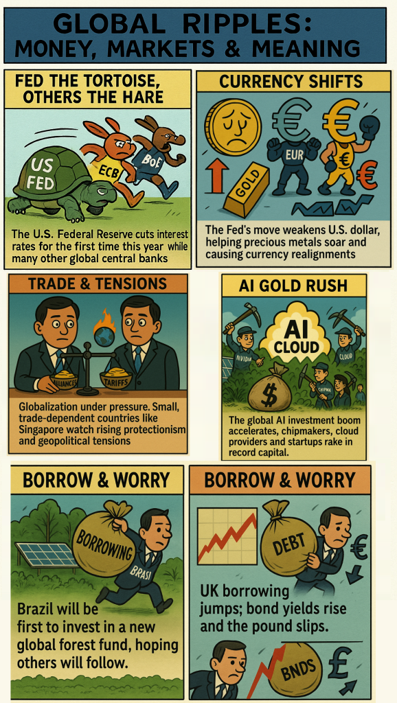 The U.S. Federal Reserve recently cut interest rates by 25 basis points. A cautious step, but one that carried enormous weight. The Fed is like a tortoise, moving slowly while othersโ€”the European Central Bank, the Bank of Englandโ€”dart around at their own pace. At 11 Wall Street, New York, traders leaned forward because even a modest decision there can alter the mood in Frankfurt, Delhi, or Johannesburg.