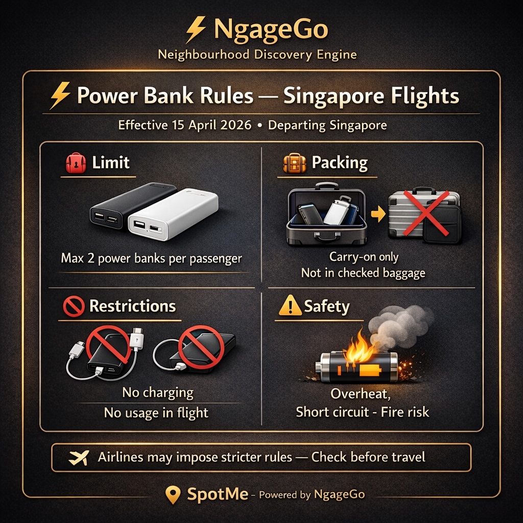 From 15 April 2026, passengers departing Singapore will be subject to a new aviation rule. Each traveller is allowed to carry a maximum of two power banks. Anything beyond that must be disposed of before boarding.