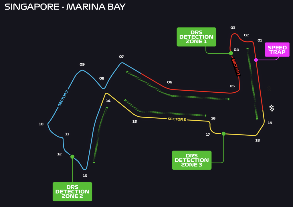 - Track layout: Due to redevelopment near the bayfront, the layout has been running a shorter ~4.928 kmconfiguration since 2023 (19 corners), with works slated through end-2026. Expect a fast back-straight where the old Turns 16–19 used to be.