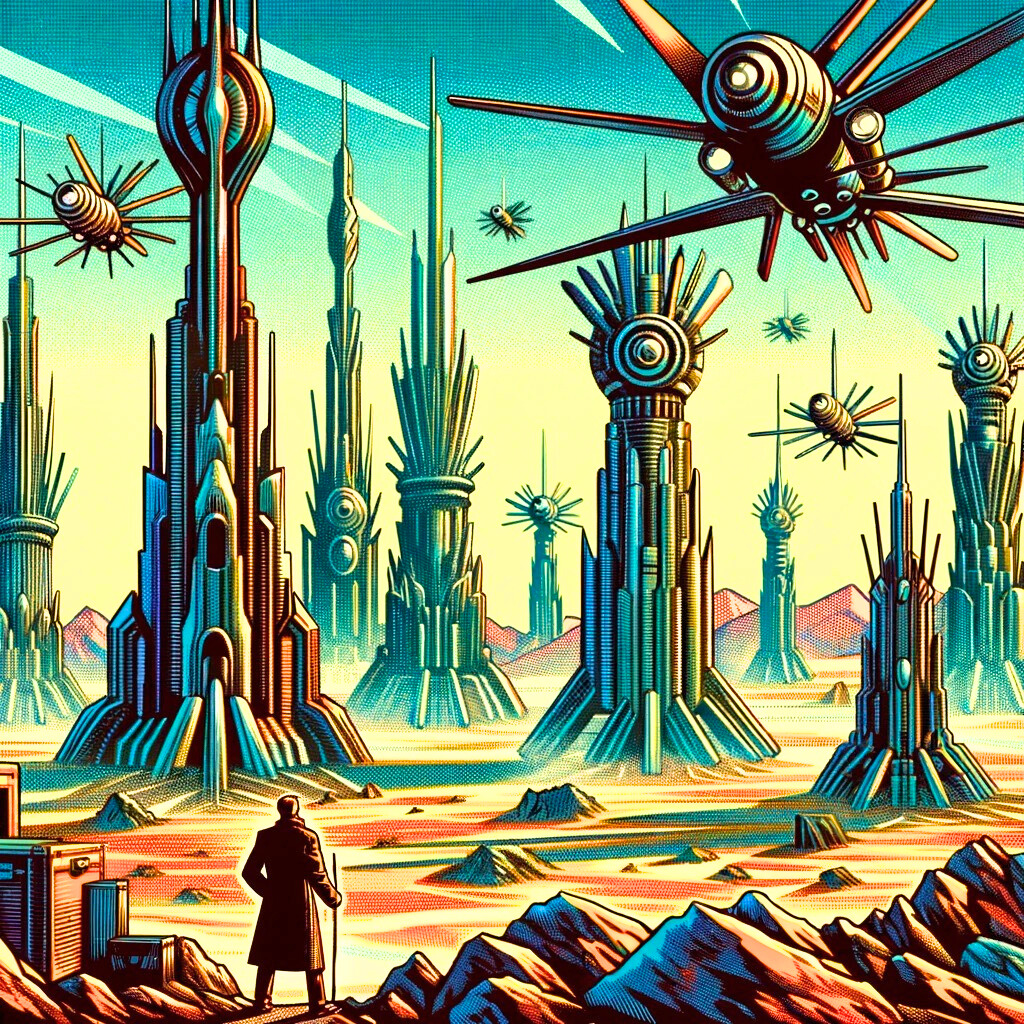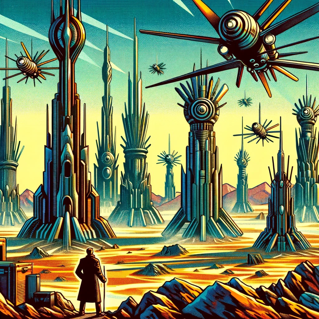 The landscape that unfolded before Wells was a blend of awe-inspiring technology and eerie desolation. Towering structures that defied the laws of physics dotted the horizon, while machines of unknown purpose flew through the air with silent grace. The Earth under the rule of the Martians was both a testament to their technological supremacy and a grim reminder of humanity’s fall.